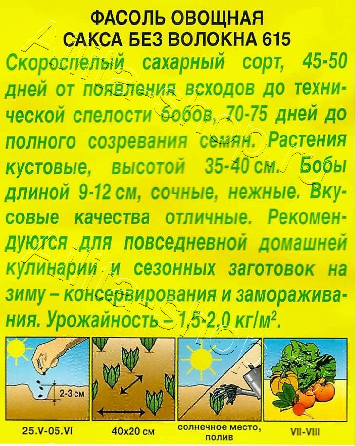 Скороспелый сахарный сорт, 45-50 дней от появления всходов до технической спелости бобов, 70-75 дней до полного созревания семян. Растения кустовые, высотой 35-40 см. Бобы длиной 9-12 см, сочные, нежные. Вкусовые качества отличные. Рекомендуются для пов седневной домашней кулинарии и сезонных заготовок на зиму – консервирования и замораживания. Урожайность – 1,5-2,0 кг/м2.