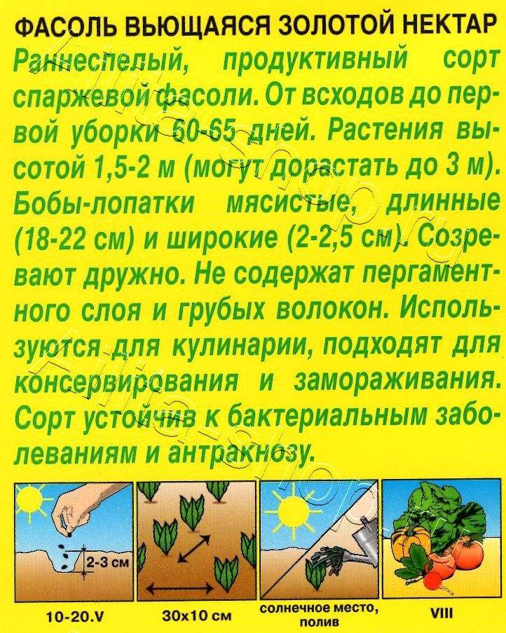 Раннеспелый, продуктивный сорт спаржевой фасоли. От всходов до первой уборки 60-65 дней. Растения высотой 1,5-2 м (могут дорастать до 3 м). Бобы-лопатки мясистые, длинные (18-22 см) и широкие (2-2,5 см). Созревают дружно. Не содержат пергаментного слоя и грубых волокон. Используются для кулинарии, подходят для консервирования и замораживания. Сорт устойчив к бактериальным заболеваниям и антракнозу.Посев семян в открытый грунт на глубину 2-3 см. Для получения более раннего урожая возможен рассадный метод культивирования. Необходимы регулярные поливы, прополки, рыхления, подкормки. У спаржевой фасоли растянутый период сбора урожая, поэтому его проводят многократно по мере созревания бобов. Частые сборы молодых лопаток стимулируют образование новых.
