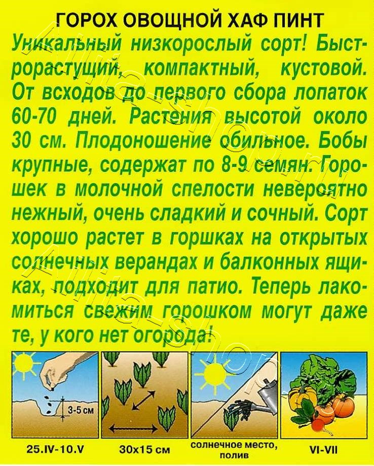 Уникальный низкорослый сорт! Быстрорастущий, компактный, кустовой. От всходов до первого сбора лопаток 60-70 дней. Растения высотой около 30 см. Плодоношение обильное. Бобы крупные, содержат по 8-9 семян. Горошек в молочной спелости невероятно нежный, очень сладкий и сочный. Сорт хорошо растет в горшках на открытых солнечных верандах и балконных ящиках, подходит для патио. Теперь лакомиться свежим горошком могут даже те, у кого нет огорода.