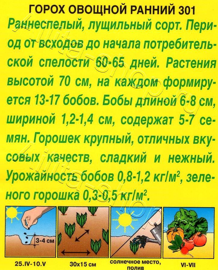 Скороспелый сорт с дружным созреванием бобов. Период от всходов до технической спелости 50-65 дней. Стебель длиной 68-71 см. Бобы лущильные, прямые, длиной 6-8 см. Общее число бобов на растении – 13-17 шт, семян в бобе – 5-7 шт. Урожайность бобов в технической спелости – 1,2 кг/м2 , зеленого горошка – 0,5 кг/м2 . Горошины крупные, сладкие, содержат до 8% сахаров. Рекомендуется для свежего потребления и консервирования. Являясь азотфиксирующей культурой, горох накапливает в почве большое количество азота и поэтому служит хорошим предшественником для других культур.Посев. Перед посевом семена замачивают в воде до набухания. Высевают семена в открытый грунт на глубину 4-6 см. Собирают урожай по мере созревания. Растениям необходимы своевременные поливы, прополки, рыхления.