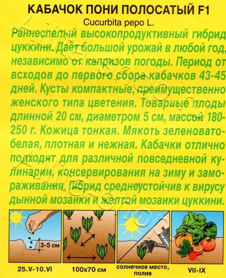 Раннеспелый высокопродуктивный гибрид цуккини. Дает большой урожай в любой год, независимо от капризов погоды. Период от всходов до первого сбора кабачков 43-45 дней. Кусты компактные, преимущественно женского типа цветения. Товарные плоды длиной 20 см, диаметром 5 см, массой 180-250 г. Кожица тонкая. Мякоть зеленовато-белая, плотная, нежная. Кабачки отлично подходят для различной повседневной кулинарии, консервирования на зиму и замораживания. Гибрид среднеустойчив к вирусу дынной мозаики и желтой мозаики цуккини.Посев семенами в грунт, в лунку по 2-3 шт. В фазе 1-2 настоящих листьев всходы прореживают, оставляя по одному сильному растению. Возможен рассадный способ с посевом 01-10.V. Рассаду в возрасте 20-25 дней высаживают в О/Г, когда минует угроза заморозков.