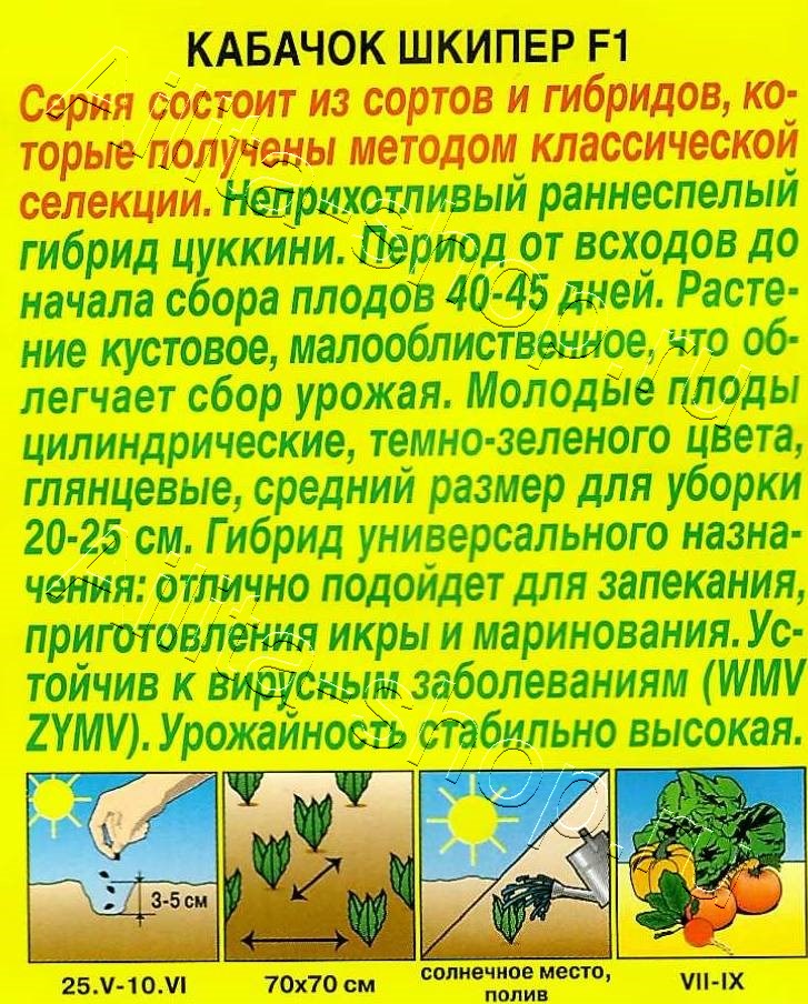 Серия состоит из сортов и гибридов, которые получены методом классической селекции. Неприхотливый раннеспелый гибрид цуккини. Период от всходов до начала сбора плодов 40-45 дней. Растение кустовое, малооблиственное, что облегчает сбор урожая. Молодые плоды цилиндрические, темно-зеленого цвета, глянцевые, средний размер для уборки 20-25 см. Гибрид универсального назначения: отлично подойдет для запекания, приготовления икры и маринования. Устойчив к вирусным заболеваниям (WMV, ZYMV). Урожайность стабильно высокая.