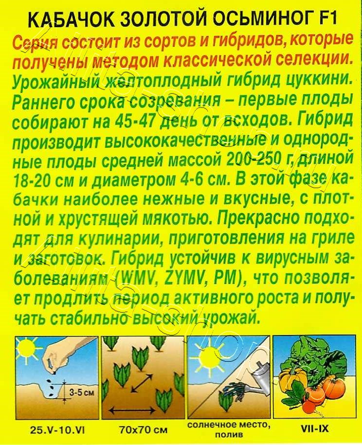Серия состоит из сортов и гибридов, которые получены методом классической селекции. Урожайный желтоплодный гибрид цуккини. Раннего срока созревания – первые плоды собирают на 45-47 день от всходов. Гибрид производит высококачественные и однородные плоды средней массой 200-250 г, длиной 18-20 см и диаметром 4-6 см. В этой фазе кабачки наиболее нежные и вкусные, с плотной и хрустящей мякотью. Прекрасно подходят для кулинарии, приготовления на гриле и заготовок. Гибрид устойчив к вирусным заболеваниям (WMV, ZYMV, PM) , что позволяет продлить период активного роста и получать стабильно высокий урожай.