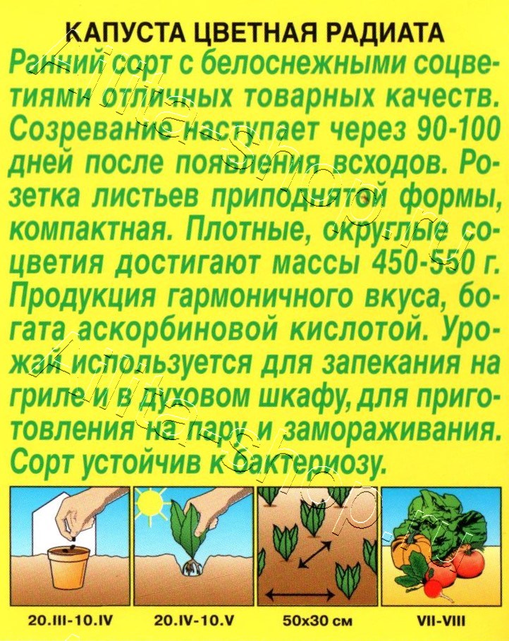 Ранний сорт с белоснежными соцветиями отличных товарных качеств. Созревание наступает через 90-100 дней после появления всходов. Розетка листьев приподнятой формы, компактная. Плотные, округлые соцветия достигают массы 450-550 г. Продукция гармоничного вкуса, богата аскорбиновой кислотой. Урожай используется для запекания на гриле и в духовом шкафу, для приготовления на пару и замораживания. Сорт устойчив к бактериозу.Посадки размещают на солнечных участках с плодородными почвами нейтральной кислотности. Для формирования качественных головок желательно применение комплексного удобрения с микроэлементами бором и молибденом.