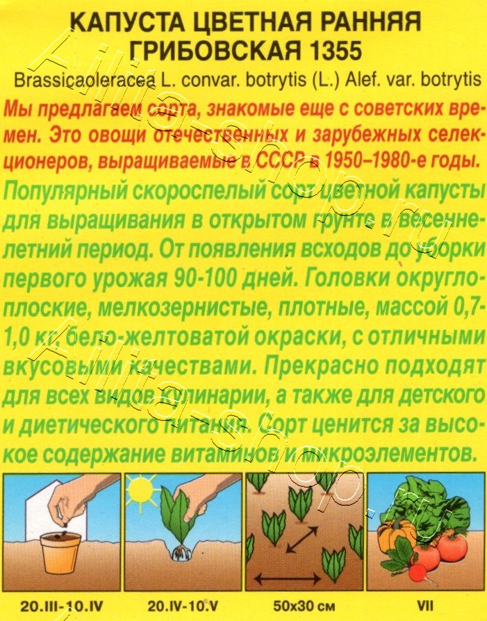 Мы предлагаем сорта, знакомые еще с советских времен. Это овощи отечественных и зарубежных селекционеров, выращиваемые в СССР в 1950–1980-е годы.Популярный скороспелый сорт цветной капусты для выращивания в открытом грунте в весеннелетний период. От появления всходов до уборки первого урожая 90-100 дней. Головки округлоплоские, мелкозернистые, плотные, массой 0,7-1,0 кг, бело-желтоватой окраски, с отличными вкусовыми качествами. Прекрасно подходят для всех видов кулинарии, а также для детского и диетического питания. Сорт ценится за высокое содержание витаминов и микроэлементов.