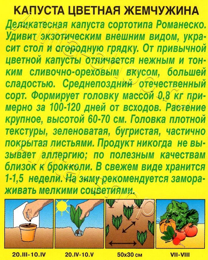Деликатесная капуста сортотипа Романеско. Удивит экзотическим внешним видом, украсит стол и огородную грядку. От привычной цветной капусты отличается нежным и тонким сливочно-ореховым вкусом, большей сладостью. Среднепоздний отечественный сорт. Формирует головку массой 0,8 кг примерно за 100-120 дней от всходов. Растение крупное, высотой 60-70 см. Головка плотной текстуры, зеленоватая, бугристая, частично покрытая листьями. Продукт никогда не вызывает аллергию; по полезным качествам близок к брокколи. В свежем виде хранится 1-1,5 недели. На зиму рекомендуется замораживать мелкими соцветиями.Посев семян на рассаду. Очень важно поддерживать температурный режим: днем 15-18 °С, ночью 12-14 °С. Высадка рассады в грунт в возрасте 30-35 дней, в фазе 4-5 настоящих листьев. В течение всего сезона нуждается в регулярных обильных поливах. Чтобы получать продукцию до поздней осени, семена на рассаду высевают в несколько сроков с интервалом 15 дней. Растениям необходимы регулярные прополки, рыхления и подкормки.