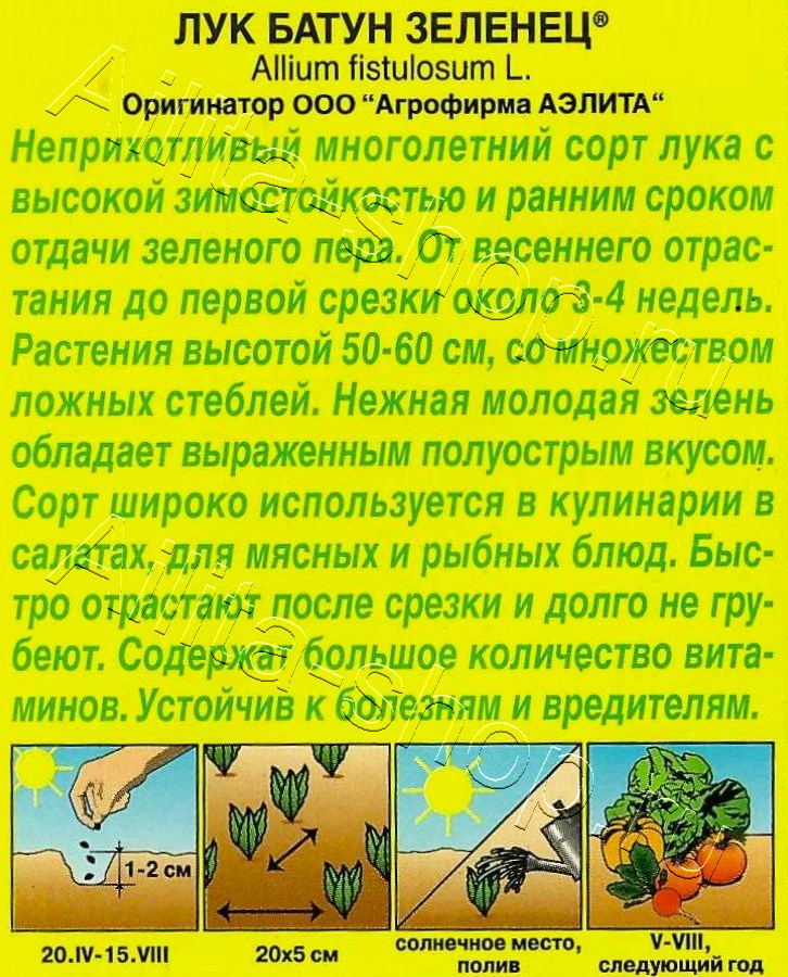 Неприхотливый многолетний сорт лука с высокой зимостойкостью и ранним сроком отдачи зеленого пера. От весеннего отрастания до первой срезки около 3-4 недель. Растения высотой 50-60 см, со множеством ложных стеблей. Нежная молодая зелень обладает выраженным полуострым вкусом. Сорт широко используется в кулинарии в салатах, для мясных и рыбных блюд. Быстро отрастают после срезки и долго не грубеют. Содержат большое количество витаминов. Устойчив к болезням и вредителям.Сорт пригоден для одно- и многолетней культуры. В однолетней культуре растения убирают целиком за один раз, при многолетней – листья срезают на высоте 5-7 см от земли 3-4 раза за сезон. Для получения ранней продукции посадки весной (еще по снегу) укрывают пленкой.