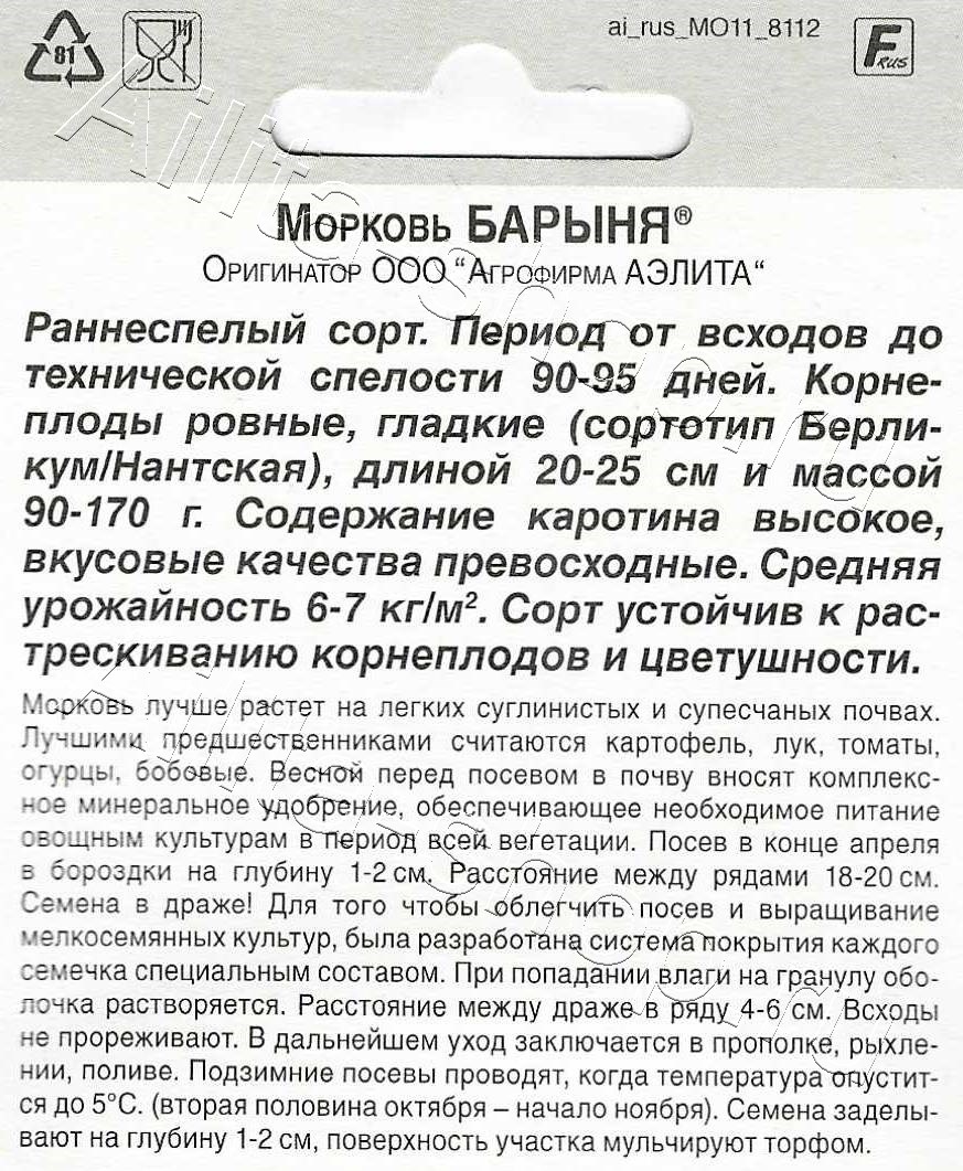 АГРОТЕХНИКА: Морковь лучше растет на легких суглинистых и супесчаных почвах. Лучшими предшественниками считаются картофель, лук, томаты, огурцы, бобовые. Весной перед посевом в почву вносят комплексное минеральное удобрение, обеспечивающее необходимое питание овощным культурам в период всей вегетации. Посев в конце апреля в бороздки на глубину 2-3 см. Расстояние между рядами 18-20 см. Семена в драже!
