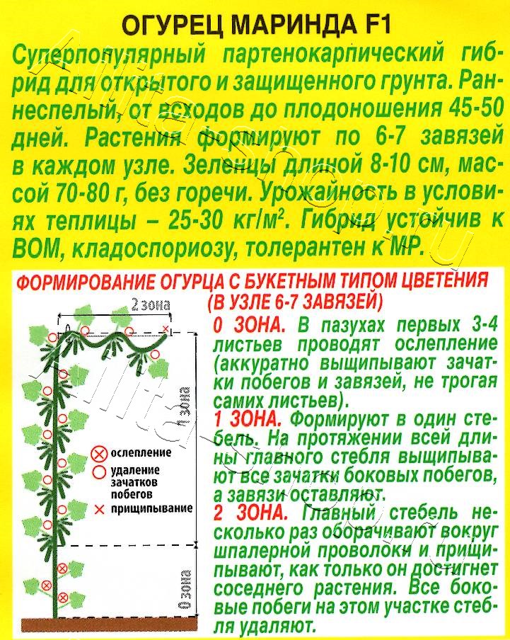 Суперпопулярный партенокарпический гибрид для открытого и защищенного грунта. Раннеспелый, от всходов до плодоношения 42-45 дней. Растения формируют по 6-7 завязей в каждом узле. Зеленцы длиной 8-10 см, массой 70-80 г, без горечи. Урожайность в условиях теплицы – 25-30 кг/м 2 . Гибрид устойчив к ВОМ, кладоспориозу, толерантен к МР.