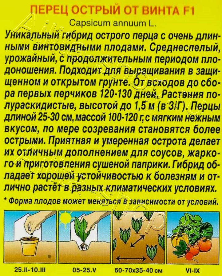 Уникальный гибрид острого перца с очень длинными винтовидными плодами. Среднеспелый, урожайный, с продолжительным периодом плодоношения. Подходит для выращивания в защищенном и открытом грунте. От всходов до сбора первых перчиков 120-130 дней. Растения полураскидистые, высотой до 1,5 м (в З/Г). Перцы длиной 25-30 см, массой 100-120 г, с мягким нежным вкусом, по мере созревания становятся более острыми. Приятная и умеренная острота делает их отличным дополнением для соусов, жаркого и приготовления сушеной паприки. Гибрид обладает хорошей устойчивостью к болезням и отлично растёт в разных климатических условиях.* Форма плодов может меняться в зависимости от условий.