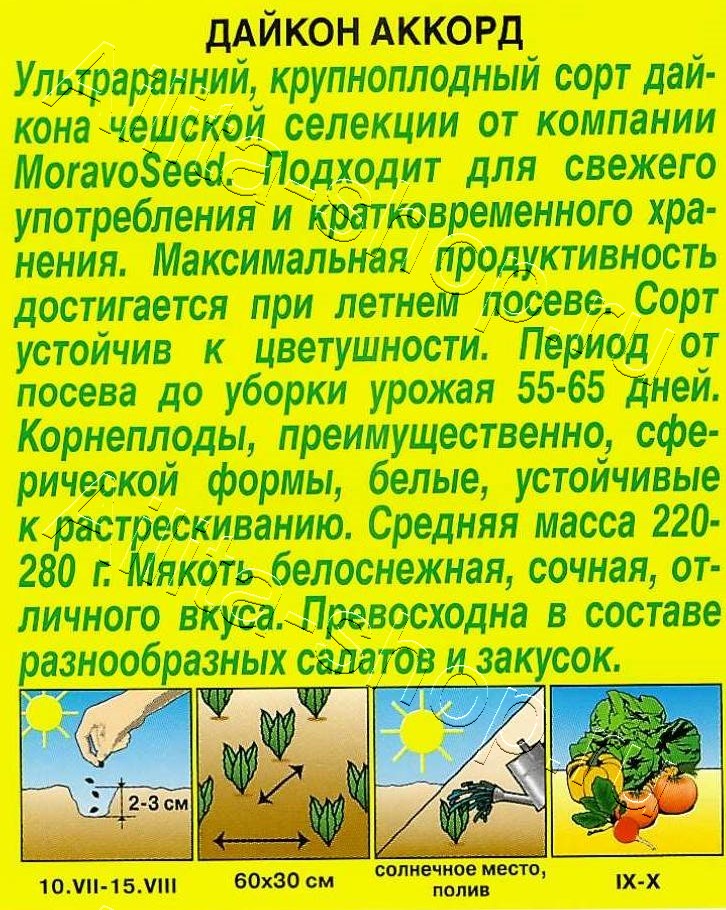 Ультраранний, крупноплодный сорт дайкона чешской селекции от компании MoravoSeed. Подходит для свежего употребления и кратковременного хранения. Максимальная продуктивность достигается при летнем посеве. Сорт устойчив к цветушности. Период от посева до уборки урожая 55-65 дней. Корнеплоды, преимущественно, сферической формы, белые, устойчивые к растрескиванию. Средняя масса 220-280 г. Мякоть белоснежная, сочная, отличного вкуса. Превосходна в составе разнообразных салатов и закусок.