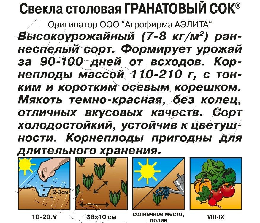 Оригинатор ООО «Агрофирма АЭЛИТА»Высокоурожайный (7-8 кг/м2) раннеспелый сорт, формирует урожай за 90-100 дней от всходов. Корнеплоды округлые, гладкие, с тонким и коротким осевым корешком, массой 110-210 г. Мякоть темно-красная, без колец, плотная, сочная, отличных вкусовых качеств. Сорт холодостойкий, устойчив к цветушности. Корнеплоды пригодны для длительного хранения. Используются в повседневной домашней кулинарии и для консервирования.