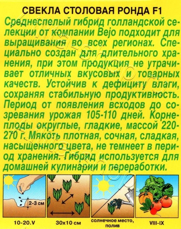 Среднеспелый гибрид голландской селекции от компании Bejo подходит для выращивания во всех регионах. Специально создан для длительного хранения, при этом продукция не утрачивает отличных вкусовых и товарных качеств. Устойчив к дефициту влаги, сохраняя стабильную продуктивность. Период от появления всходов до созревания урожая 105-110 дней. Корнеплоды округлые, гладкие, массой 220- 270 г. Мякоть плотная, сочная, сладкая, насыщенного цвета, не темнеет в пери од хранения. Гибрид используется для домашней кулинарии и переработки. Добавить к заказу