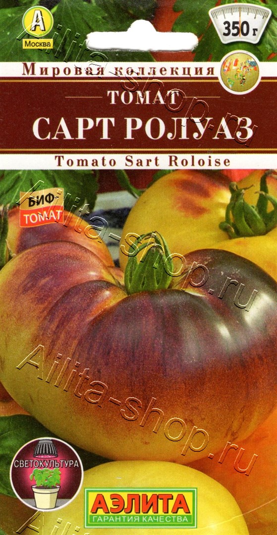 Экзотический среднеспелый сорт из Бельгии под названием Sart Roloise покоряет всех своим оригинальным видом и цветом. Для теплиц средней полосы и открытого грунта южных регионов. От всходов до созревания первых томатов 110-115 дней. Растения индетерминантные, в теплице вырастают до 180 см. Куст формирует простые кисти по 3-5 завязей. Плоды* плоскоокруглые, в стадии зрелости кремового цвета с фиолетовыми штрихами на боках и плечиках, массой 250-350 г. Очень красивые! Не вызывают аллергии. Мякоть плотная, мясистая и сочная, с необычным десертным вкусом. Сорт с высокой устойчивостью к стрессовым условиям, отлично завязывает плоды даже при недостаточном освещении.*Форма плодов может меняться в зависимости от условий.