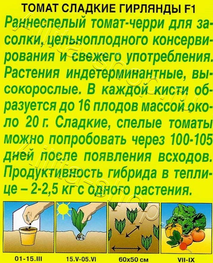 Раннеспелый томат-черри для засолки, цельноплодного консервирования и свежего употребления. Растения индетерминантные, высокорослые. В каждой кисти образуется до 16 плодов массой около 20 г. Сладкие, спелые томаты можно попробовать через 100-105 дней после появления всходов. Продуктивность гибрида в теплице – 2-2,5 кг с одного растения.