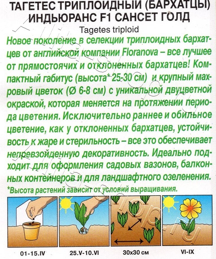 Новое поколение в селекции триплоидных бархатцев от английской компании Floranova – все лучшее от прямостоячих и отклоненных бархатцев! Компактный габитус (высота* 25-30 см) и крупный махровый цветок ( Ø 6-8 см) с уникальной двуцветной окраской, которая меняется на протяжении периода цветения. Исключительно раннее и обильное цветение, как у отклоненных бархатцев, устойчивость к жаре и стерильность – все это обеспечивает непревзойденную декоративность. Идеально подходит для оформления садовых вазонов, балконных контейнеров и для ландшафтного озеленения.* Высота растений зависит от условий выращивания.