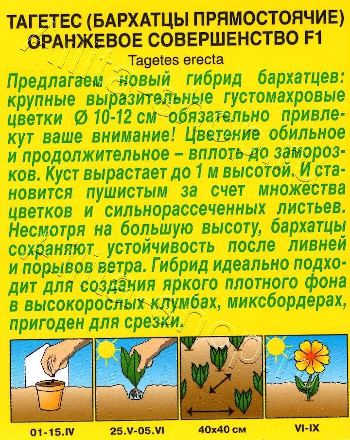 Предлагаем новый гибрид бархатцев: крупные выразительные густомахровые цветки диаметром 10-12 см обязательно привлекут ваше внимание! Цветение обильное и продолжительное – вплоть до заморозков. Куст вырастает до 1 м высотой. И становится пушистым за счет множества цветков и сильнорассеченных листьев. Несмотря на большую высоту, бархатцы сохраняют устойчивость после ливней и порывов ветра. Гибрид идеально подходит для создания яркого плотного фона в высокорослых клумбах, миксбордерах, пригоден для срезки.Бархатцы предпочитают солнечные участки с дренированными, плодородными почвами нейтральной кислотности. Растения теплолюбивые, быстрорастущие, взрослые – достаточно засухоустойчивые.