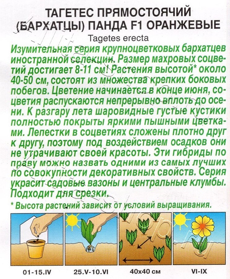 Изумительная серия крупноцветковых бархатцев иностранной селекции. Размер махровых соцветий достигает 8-11 см! Растения высотой* около 40-50 см, состоят из множества крепких боковых побегов. Цветение начинается в конце июня, соцветия распускаются непрерывно вплоть до осени. К разгару лета шаровидные густые кустики полностью покрыты яркими пышными цветками. Лепестки в соцветиях сложены плотно друг к другу, поэтому под воздействием осадков они не утрачивают своей красоты. Эти гибриды по праву можно назвать одними из самых лучших по совокупности декоративных свойств. Серия украсит садовые вазоны и центральные клумбы. Подходит для срезки.* Высота растений зависит от условий выращивания.