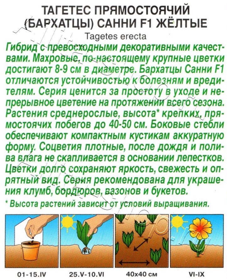 Гибрид с превосходными декоративными качествами. Махровые, по-настоящему крупные цветки достигают 8-9 см в диаметре. Бархатцы Санни F1 отличаются устойчивостью к болезням и вредителям. Серия ценится за простоту в уходе и непрерывное цветение на протяжении всего сезона. Растения среднерослые, высота* крепких, прямостоячих побегов до 40-50 см. Боковые стебли обеспечивают компактным кустикам аккуратную форму. Соцветия плотные, после дождя и полива влага не скапливается в основании лепестков. Цветки долго сохраняют яркость, свежесть и опрятный вид. Серия рекомендована для украшения клумб, бордюров, вазонов и букетов.* Высота растений зависит от условий выращивания.