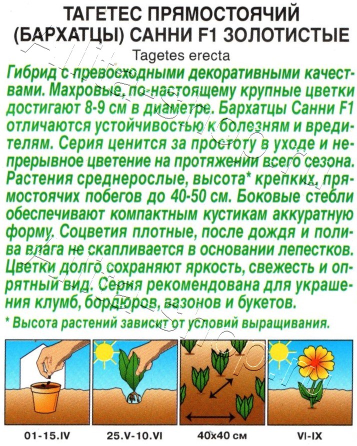 Гибрид с превосходными декоративными качествами. Махровые, по-настоящему крупные цветки достигают 8-9 см в диаметре. Бархатцы Санни F1 отличаются устойчивостью к болезням и вредителям. Серия ценится за простоту в уходе и непрерывное цветение на протяжении всего сезона. Растения среднерослые, высота* крепких, прямостоячих побегов до 40-50 см. Боковые стебли обеспечивают компактным кустикам аккуратную форму. Соцветия плотные, после дождя и полива влага не скапливается в основании лепестков. Цветки долго сохраняют яркость, свежесть и опрятный вид. Серия рекомендована для украшения клумб, бордюров, вазонов и букетов.* Высота растений зависит от условий выращивания.
