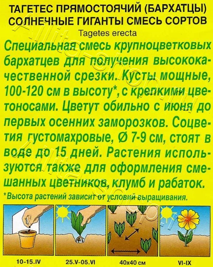 Специальная смесь крупноцветковых бархатцев для получения высококачественной срезки. Кусты мощные, 100-120 см в высоту*, с крепкими цветоносами. Цветут обильно с июня до первых осенних заморозков. Соцветия густомахровые, 7-9 см, стоят в воде до 15 дней. Растения используются также для оформления смешанных цветников, клумб и рабаток.* Высота растений зависит от условий выращивания.