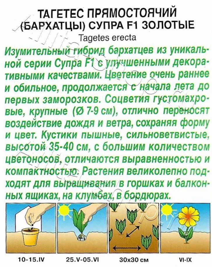 Гибрид бархатцев из серии СУПРА F1 с улучшенными декоративными качествами. Цветение очень раннее и обильное, продолжается с начала лета до первых заморозков. Соцветия густомахровые, крупные (Ø7-9 см), отлично переносят воздействие дождя и ветра сохраняя форму и цвет. Кустики пышные, сильноветвистые, высотой 30-35 см, с большим количеством цветоносов, отличаются выравненностью и компактностью. Растения холодостойкие, неприхотливые к почвам. Великолепно подходят для выращивания в горшках и балконных ящиках, на клумбах, в бордюрах и цветниках. Выращивают рассадным способом. Посев проводят в первой половине апреля. Всходы появляются через 4-8 дней после посева, сеянцы пикируют в фазе 1-2-х настоящих листьев. Рассаду высаживают в конце мая - начале июня. Возможен посев в открытый грунт в мае на глубину 1,5-2 см.