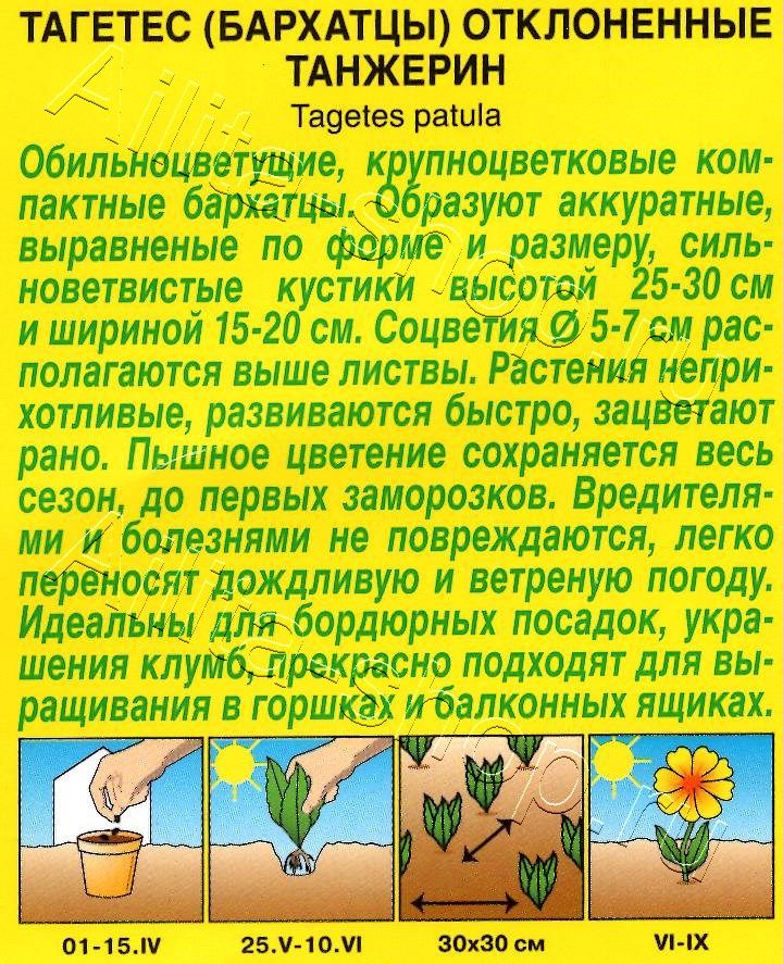 Обильноцветущие, крупноцветковые компактные бархатцы. Образуют аккуратные, выравненые по форме и размеру, сильноветвистые кустики высотой 25-30 см и шириной 15-20 см. Соцветия Ø 5-7 см располагаются выше листвы. Растения неприхотливые, развиваются быстро, зацветают рано. Пышное цветение сохраняется весь сезон, до первых заморозков. Вредителями и болезнями не повреждаются, легко переносят дождливую и ветреную погоду. Идеальны для бордюрных посадок, украшения клумб, прекрасно подходят для выращивания в горшках и балконных ящиках.Выращивают рассадным способом. Посев семян проводят в первой половине апреля. Всходы появляются через 4-8 дней после посева, сеянцы пикируют в фазе одного-двух настоящих листьев. Рассаду высаживают в конце мая-начале июня. Возможен посев в открытый грунт в мае на глубину 1см. Растениям необходимы регулярные поливы, прополки, рыхления и подкормки.