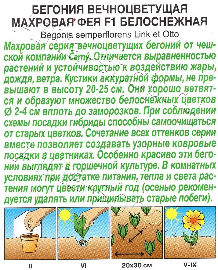 Махровая серия вечноцветущих бегоний от чешской компании ?ern?. Отличается выравненностью растений и устойчивостью к воздействию жары, дождя, ветра. Кустики аккуратной формы, не превышают в высоту 20-25 см. Они хорошо ветвятся и образуют множество нежно-розовых цветков ? 2-4 см вплоть до заморозков. При соблюдении схемы посадки гибриды способны самоочищаться от старых цветков. Сочетание всех оттенков серии вместе позволяет создавать узорные ковровые посадки в цветниках. Особенно красиво эти бегонии выглядят в горшечной культуре. В комнатных условиях при достатке питания, тепла и света растения могут цвести круглый год (осенью рекомендуется удалять или прищипывать старые побеги).Семена в гранулах! Гранулы располагают на поверхности почвы, не заделывая их, хорошо увлажняют из распылителя. При попадании влаги на гранулу оболочка должна раствориться. Посевы накрывают стеклом для сохранения постоянной влажности до полных всходов. Зимним посевам требуется досветка.
