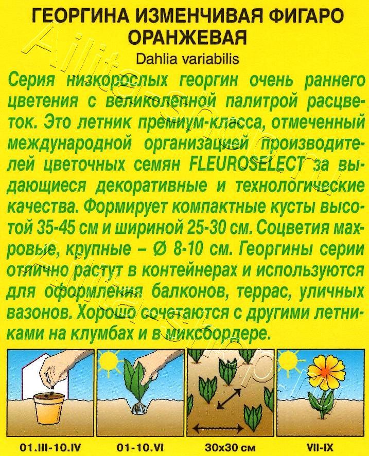 Георгины серии ФИГАРО формируют компактные кусты высотой 35-45 см и шириной 25-30 см. Это летник премиум-класса, с крупными махровыми соцветиями Ø10 см. Цветет с июля до заморозков. Отмечен международной организацией производителей цветочных семян FLEUROSELECT за выдающиеся декоративные и технологические качества. Георгины серии отлично растут в контейнерах, украшая балконы, террасы, уличные вазоны. Хорошо компонуются с другими летниками на клумбах и в миксбордере.