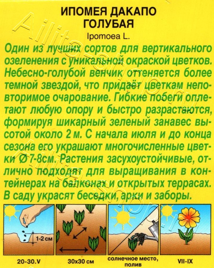 Один из лучших сортов для вертикального озеленения с уникальной окраской цветков. Небесно-голубой венчик оттеняется более темной звездой, что придает цветкам неповторимое очарование. Гибкие побеги оплетают любую опору и быстро разрастаются, формируя шикарный зеленый занавес высотой до 2-3 м. С середины лета и до конца сезона его украшают многочисленные цветки диаметром 7-8 см. Растения засухоустойчивые, отлично подходят для выращивания в контейнерах на балконах и открытых террасах. В саду украсят беседки, арки и заборы.Ипомея предпочитает дренированные почвы без избытка органики. Посев на рассаду предварительно замоченными семенами, гнездами по 2-3 шт., на глубину 1-2 см. Растения высаживают в грунт с комом почвы. В южных регионах возможен прямой посев в мае.