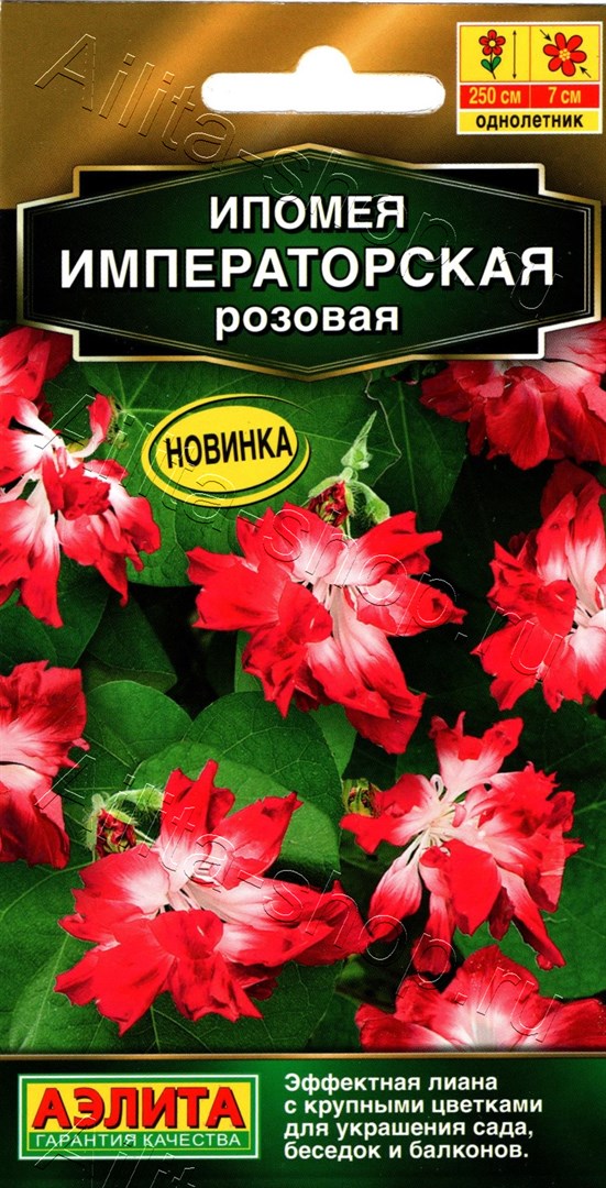 Великолепная лиана с двухцветными, яркими, махровыми, полумахровыми и простыми цветками диаметром до 6-7 см. Однолетние крепкие растения достигают высоты 2,5 м, активно развиваются и обильно зацветают в разгар лета. Образуют плотный зеленый занавес за счет большого числа боковых побегов. Ипомея – одна из самых красивых цветочных культур. Ее часто называют цветком утренней зари, т.к. все бутоны распускаются ранним утром в отличие от большинства декоративных растений. Сорт эффектно смотрится в саду, отлично подходит для оформления беседок, пергол. При обеспечении регулярного полива и удобрения может выращиваться на балконе в крупном горшке и с опорой.Ипомея предпочитает дренированные почвы без избытка органики. Посев на рассаду предварительно замоченными семенами, гнездами по 2-3 шт., на глубину 1-2 см. Растения высаживают в грунт с комом почвы. В южных регионах возможен прямой посев в мае.