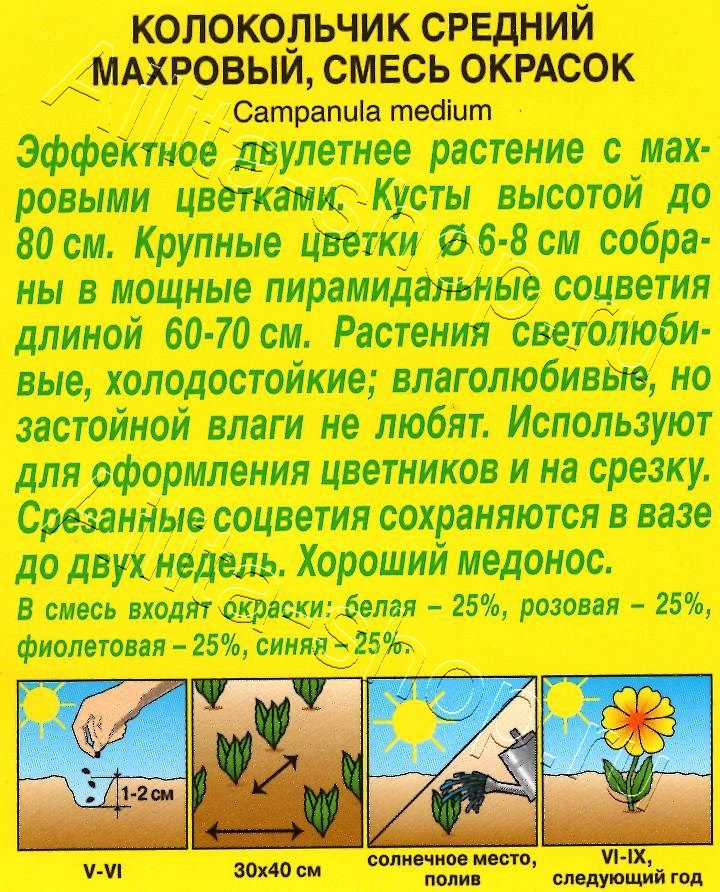 Эффектное двулетнее растение с крупными (Ø6-8 см) махровыми бокальчато-колокольчатыми цветками. Стебли прямостоячие, мощные, высотой до 80 см. Цветки собраны в большие пирамидальные соцветия 60-70 см длиной. Колокольчики светолюбивые, холодостойкие, влаголюбивые, но не переносят застоя воды в почве. Используются для одиночных и групповых посадок в сборных цветниках или рабатках. Отлично подходят для букетов, срезанные цветы сохраняются в воде до двух недель. Хороший медонос.