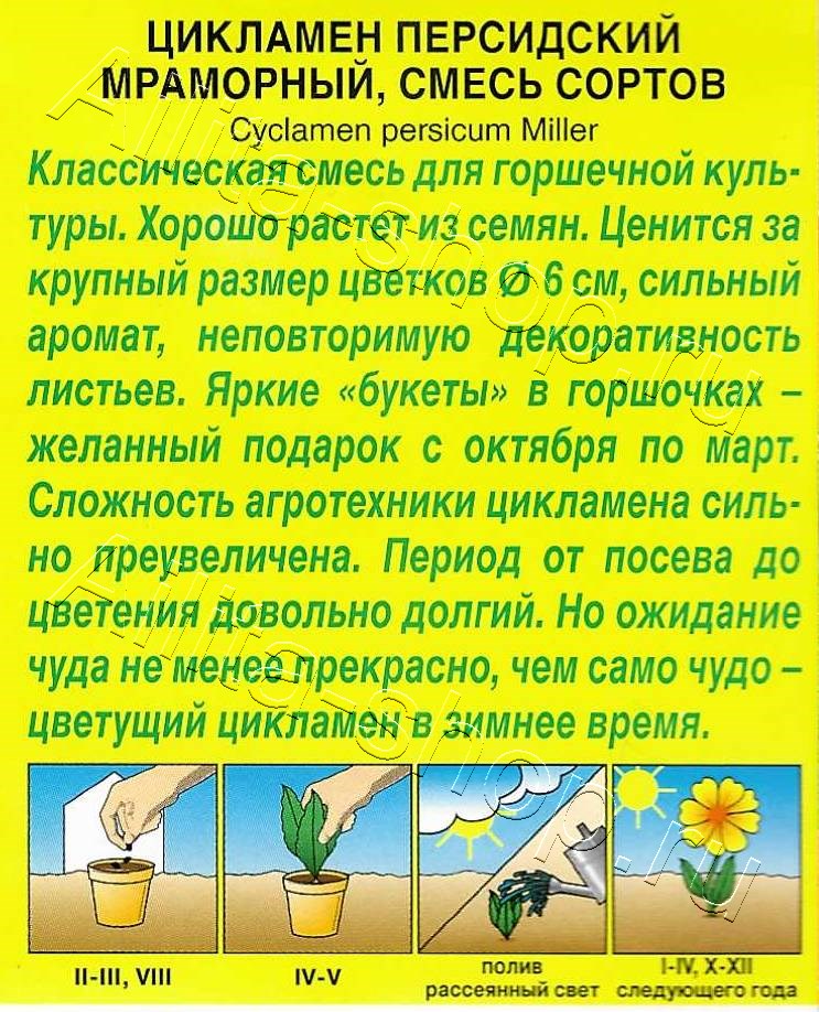 Классическая смесь для горшечной культуры. Хорошо растет из семян. Ценится за крупный размер цветков ? 6 см, сильный аромат, неповторимую декоративность листьев. Яркие «букеты» в горшочках – желанный подарок с октября по март. Сложность агротехники цикламена сильно преувеличена. Период от посева до цветения довольно долгий. Но ожидание чуда не менее прекрасно, чем само чудо – цветущий цикламен в зимнее время.Посев можно проводить в любое время года, но наиболее оптимальный срок – февраль–март. Семена прорастают 30-40 дней. Сеянцы быстро образуют маленькие клубни. Через 6-7 месяцев молодые цикламенчики пересаживают в горшки ? 6-7 см. Клубеньки после пересадки в горшки должны на одну треть возвышаться над землей.