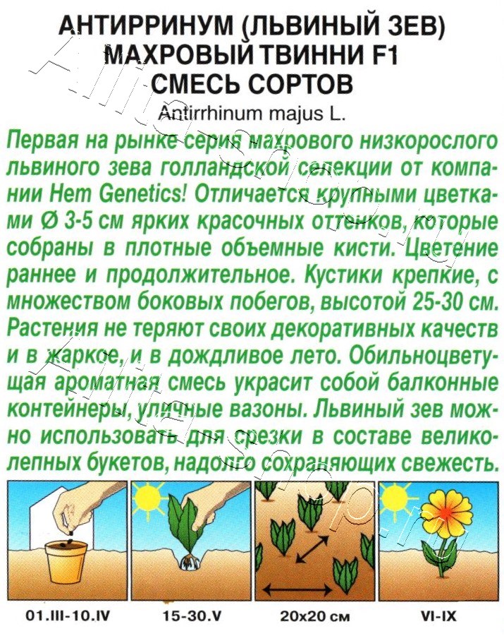 Первая на рынке серия махрового низкорослого львиного зева! Отличается крцпными цветками диаметром 3-5 см ярких красочных оттенков, которые собраны в плотные объемные кисти. Цветение раннее и продолжительное. кустики крепкие, с множеством боковых побегов, высотой 25-30 см. Растения не теряют своих декоративных качеств и в жаркое, и в дождливое лето. Обильноцветущая ароматная смесь украсит собой балконные контейнеры, уличные вазоны. Львиный зев можно использовать для срезки в составе великолепных букетов, надолго сохраняющих свежесть.
