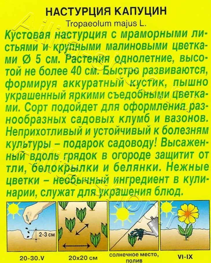 Кустовая настурция с мраморными листьями и крупными малиновыми цветками диаметром 5 см. Растения однолетние, высотой не более 40 см. Быстро развиваются, формируя аккуратный кустик, пышно украшенный яркими съедобными цветками. Сорт подойдет для оформления разнообразных садовых клумб и вазонов. Неприхотливый и устойчивый к болезням культуры – подарок садоводу! Высаженный вдоль грядок в огороде защитит от тли, белокрылки и белянки. Нежные цветки – необычный ингредиент в кулинарии, служат для украшения блюд.Семена перед посевом желательно замочить. Настурция хорошо растет и цветет на умеренно влажных почвах среднего плодородия. На высокоплодородных или переудобренных почвах наблюдается сильное развитие вегетативной массы в ущерб цветению.