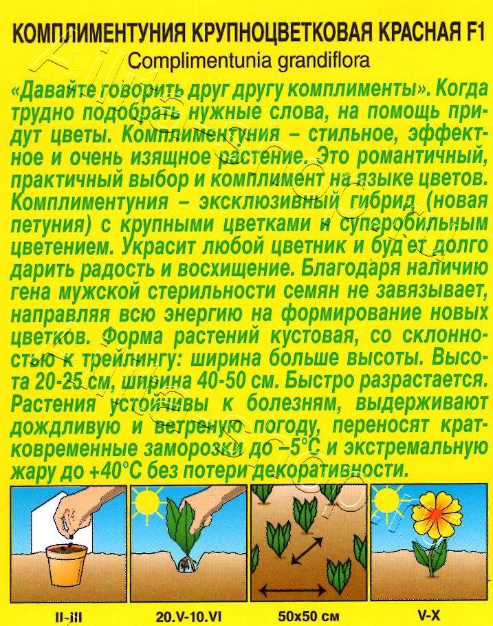 Комплиментуния – стильное, эффектное и очень изящное растение. Это романтичный, практичный выбор и комплимент на языке цветов. Комплиментуния – эксклюзивный гибрид (новая петуния) с крупными цветками и суперобильным цветением. Украсит любой цветник и будет долго дарить радость и восхищение. Благодаря наличию гена мужской стерильности семян не завязывает, направляя всю энергию на формирование новых цветков. Форма растений кустовая, со склонностью к трейлингу: ширина больше высоты. Высота 20-25 см, ширина 40-50 см. Быстро разрастается. Растения устойчивы к болезням, выдерживают дождливую и ветреную погоду, переносят кратковременные заморозки до –5°С и экстремальную жару до +40°С без потери декоративности.Посев на рассаду с февраля до апреля. Семена в гранулах! Посев поверхностный, без заделки (семена прорастают на свету!), под стекло или пленку для сохранения постоянной влажности до полных всходов. Гранулы при посеве должны растворяться. Февральским посевам требуется подсветка.