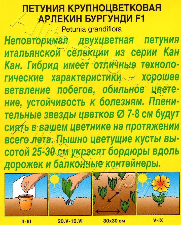 Неповторимая крупноцветковая петуния от итальянской компании Farao из серии Саn Can. Обладает отличными декоративными качествами: густой куст высотой 25-30 см, пышное цветение, устойчивость к болезням. Пленительные звезды слегка бахромчатых цветков Ø 7-8 см будут сиять в вашем саду на протяжении всего лета. В зависимости от условий выращивания соотношение белого и красного оттенков на венчиках может значительно меняться, в этом состоит уникальность гибридов Арлекин. Серия украсит бордюры вдоль дорожек, цветники и балконные контейнеры.Добавить к заказу