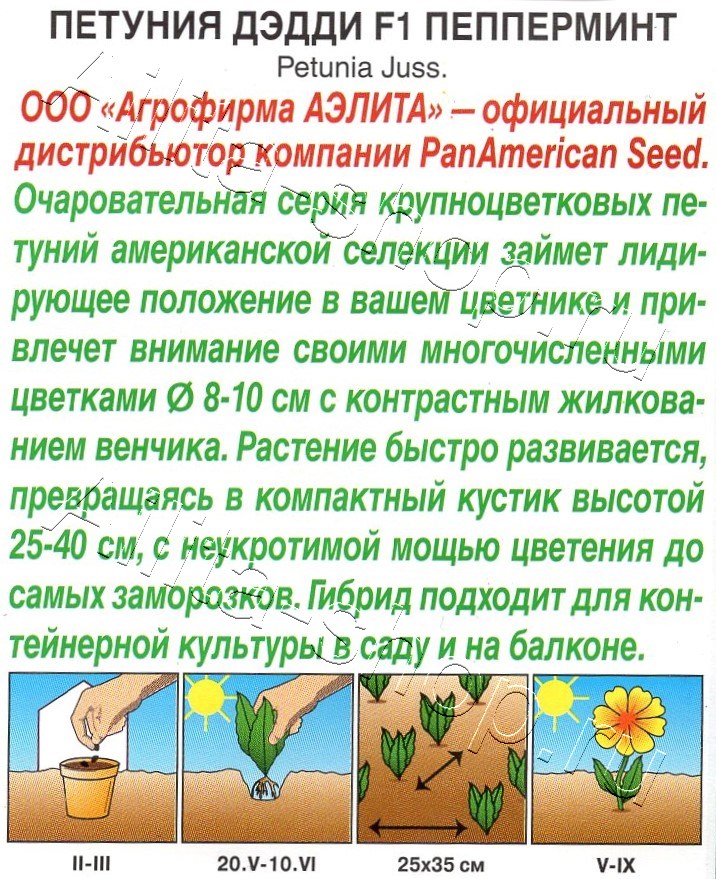 Очаровательная серия крупноцветковых петуний американской селекции займет лидирующее положение в вашем цветнике и привлечет внимание своими многочисленными цветками 8-10 см с контрастным жилкованием венчика. Растение быстро развивается, превращаясь в компактный кустик высотой 25-40 см, с неукротимой мощью цветения до самых заморозков. Гибрид подходит для контейнерной культуры в саду и на балконе.Семена в гранулах! Гранулы располагают на поверхности почвы, не заделывая их, хорошо увлажняют из распылителя. При попадании влаги на гранулу оболочка должна раствориться. Посевы накрывают стеклом для сохранения постоянной влажности до полных всходов. Февральским посевам требуется дополнительная подсветка.