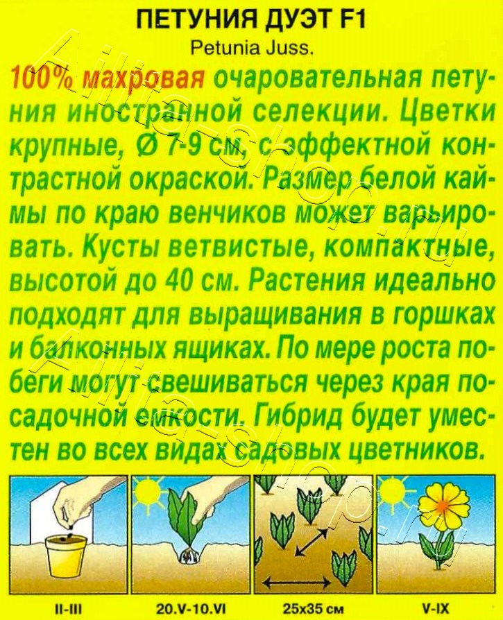 100% махровая очаровательная петуния иностранной селекции. Цветки крупные, диаметром 7-9 см, с эффектной контрастной окраской. Размер белой каймы по краю венчиков может варьировать. Кусты ветвистые, компактные, высотой до 40 см. Растения идеально подходят для выращивания в горшках и балконных ящиках. По мере роста побеги могут свешиваться через края посадочной емкости. Гибрид будет уместен во всех видах садовых цветников.Семена в гранулах! Гранулы располагают на поверхности почвы, не заделывая их, хорошо увлажняют из распылителя. При попадании влаги на гранулу оболочка должна раствориться. Посевы накрывают стеклом для сохранения постоянной влажности до полных всходов. Февральским посевам требуется дополнительная подсветка.