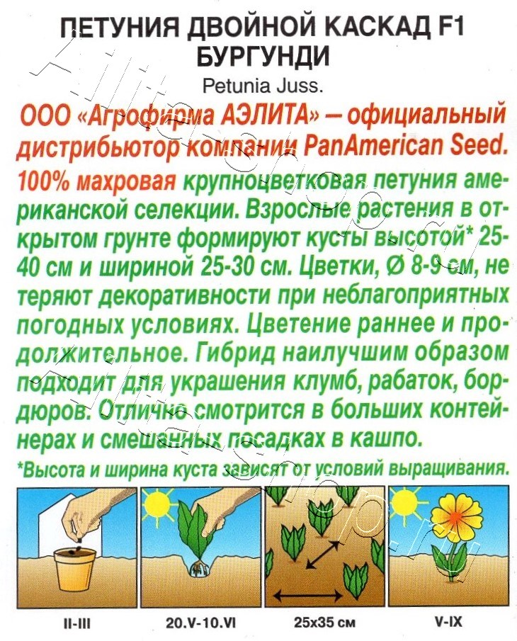100% махровая крупноцветковая петуния американской селекции. Взрослые растения в открытом грунте формируют кусты высотой* 25-40 см и шириной 25-30 см. Цветки, 8-9 см, не теряют декоративности при неблагоприятных погодных условиях. Цветение раннее и продолжительное. Гибрид наилучшим образом подходит для украшения клумб, рабаток, бордюров. Отлично смотрится в больших контейнерах и смешанных посадках в кашпо.*Высота и ширина куста зависят от условий выращивания.