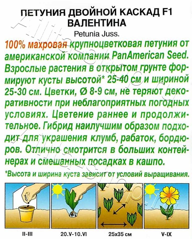 100% махровая крупноцветковая петуния от американской компании PanAmerican Seed. Взрослые растения в открытом грунте формируют кусты высотой* 25-40 см и шириной 25-30 см. Цветки, Ø 8-9 см, не теряют декоративности при неблагоприятных погодных условиях. Цветение раннее и продолжительное. Гибрид наилучшим образом подходит для украшения клумб, рабаток, бордюров. Отлично смотрится в больших контейнерах и смешанных посадках в кашпо.*Высота и ширина куста зависит от условий выращивания.
