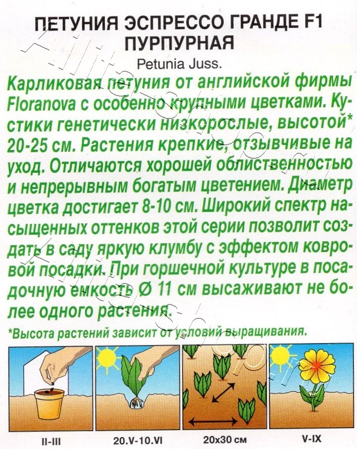 Карликовая петуния от английской фирмы Floranova с особенно крупными цветками. Кустики генетически низкорослые, высотой* 20-25 см. Растения крепкие, отзывчивые на уход. Отличаются хорошей облиственностью и непрерывным богатым цветением. Диаметр цветка достигает 8-10 см. Широкий спектр насыщенных оттенков этой серии позволит создать в саду яркую клумбу с эффектом ковровой посадки. При горшечной культуре в посадочную емкость Ø 11 см высаживают не более одного растения.*Высота растений зависит от условий выращивания.