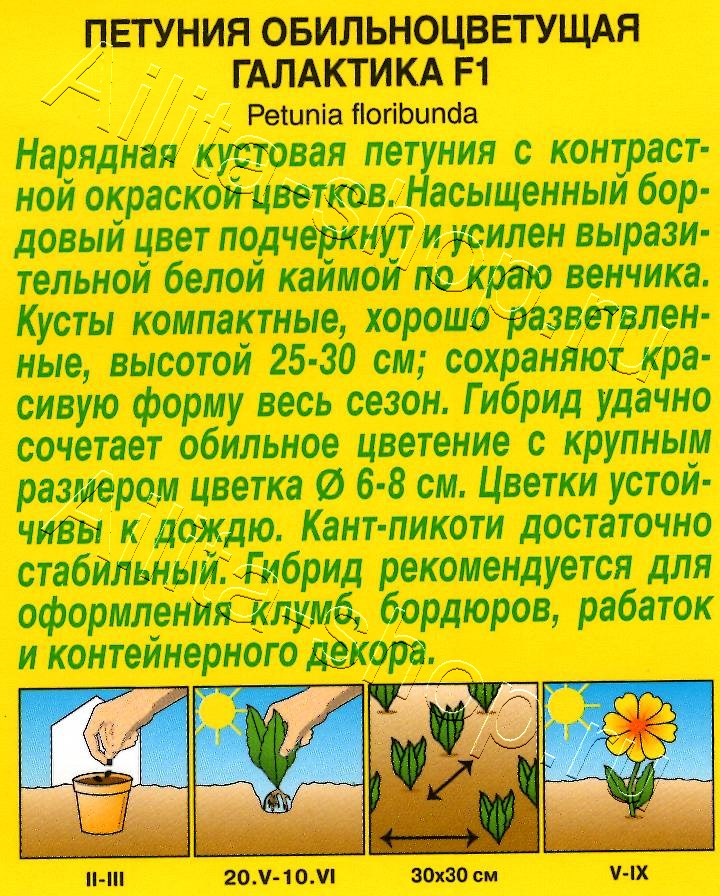 Нарядная многоцветковая петуния с контрастной окраской цветков. Насыщенный цвет подчеркнут и усилен выразительной белой каймой по краю венчика. Кусты компактные, хорошо разветвленные, высотой* 25-30 см; сохраняют красивую форму весь сезон. Гибрид удачно сочетает обильное цветение с крупным размером цветка Ø 6-8 см. Кант-пикоти может меняться от температурных воздействий и неблагоприятных погодных условий. Гибрид рекомендуется для оформления клумб, бордюров, рабаток и контейнерного декора.*Высота растений зависит от условий выращивания.