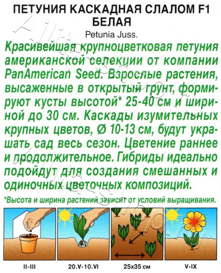 Красивейшая крупноцветковая петуния иностранной селекции. Взрослые растения, высаженные в открытый грунт, формируют кусты высотой* 25-40 см и шириной до 30 см. Каскады изумительных крупных цветов диаметром 10-13 см, будут украшать сад весь сезон. Цветение раннее и продолжительное. Гибриды идеально подойдут для создания смешанных и одиночных цветочных композиций.*Высота и ширина растений зависит от условий выращивания.