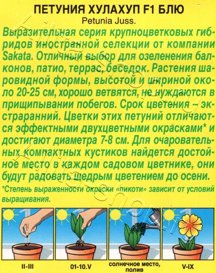 Выразительная серия крупноцветковых гибридов иностранной селекции от компании Sakata. Отличный выбор для озеленения балконов, патио, террас, беседок. Растения шаровидной формы, высотой и шириной около 20-25 см, хорошо ветвятся, не нуждаются в прищипывании побегов. Срок цветения – экстраранний. Цветки этих петуний отличаются эффектными двухцветными окрасками* и достигают диаметра 7-8 см. Для очаровательных компактных кустиков найдется достойное место в каждом садовом цветнике, они будут радовать щедрым цветением до осени.*Степень выраженности окраски «пикоти» зависит от условий выращивания.