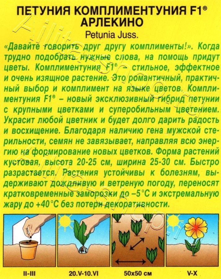 «Давайте говорить друг другу комплименты». Когда трудно подобрать нужные слова, на помощь придут цветы. Комплиментуния F1® – стильное, эффектное и очень изящное растение. Это романтичный, практичный выбор и комплимент на языке цветов. Комплиментуния F1® – эксклюзивный гибрид (новая петуния) с крупными цветками и суперобильным цветением. Украсит любой цветник и будет долго дарить радость и восхищение. Благодаря наличию гена мужской стерильности семян не завязывает, направляя всю энергию на формирование новых цветков. Форма растений кустовая, со склонностью к трейлингу: ширина больше высоты. Высота 20-25 см, ширина 25-30 см. Быстро разрастается. Растения устойчивы к болезням, выдерживают дождливую и ветреную погоду, переносят кратковременные заморозки до –5°С и экстремальную жару до +40°С без потери декоративности.