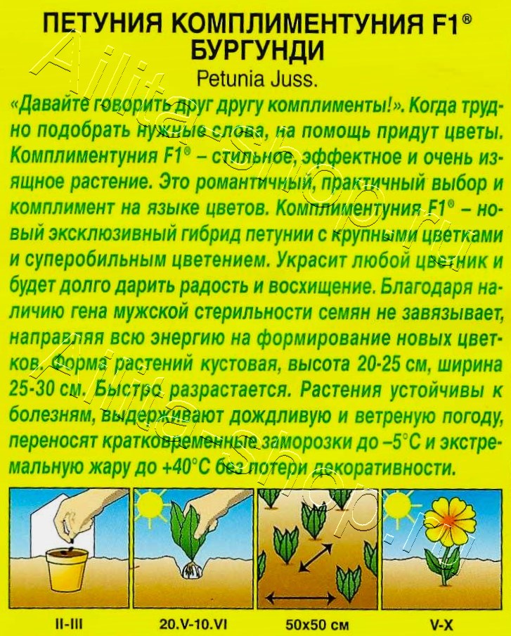 «Давайте говорить друг другу комплименты». Когда трудно подобрать нужные слова, на помощь придут цветы. Комплиментуния– стильное, эффектное и очень изящное растение. Это романтичный, практичный выбор и комплимент на языке цветов. Комплиментуния– эксклюзивный гибрид (новая петуния) с крупными цветками и суперобильным цветением. Украсит любой цветник и будет долго дарить радость и восхищение. Благодаря наличию гена мужской стерильности семян не завязывает, направляя всю энергию на формирование новых цветков. Форма растений кустовая: ширина больше высоты. Высота 20-25 см, ширина 25-30 см. Быстро разрастается. Растения устойчивы к болезням, выдерживают дождливую и ветреную погоду, переносят кратковременные заморозки до –5°С и экстремальную жару до +40°С без потери декоративности.Семена в гранулах! Гранулы располагают на поверхности почвы, не заделывая их, хорошо увлажняют из распылителя. При попадании влаги на гранулу оболочка должна раствориться.