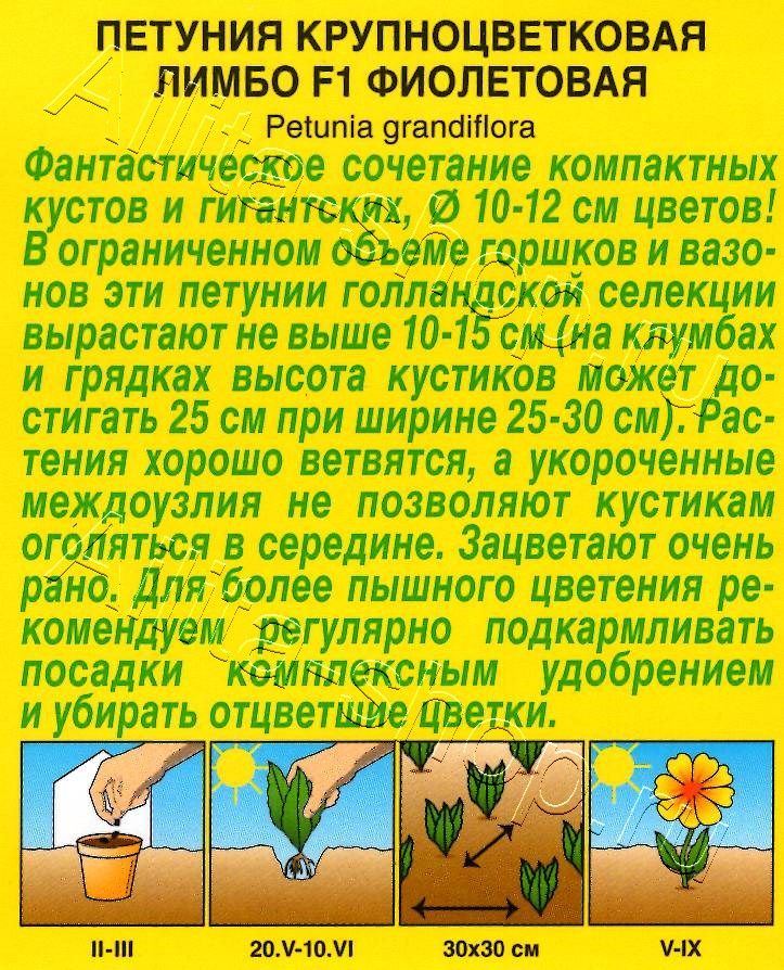 Фантастическое сочетание компактных кустов и гигантских, Ø 10-12 см цветов! В ограниченном объеме горшков и вазонов эти петунии голландской селекции вырастают не выше 10-15 см (на клумбах и грядках высота кустиков может достигать 25 см при ширине 25-30 см). Растения хорошо ветвятся, а укороченные междоузлия не позволяют кустикам оголяться в середине. Зацветают очень рано. Для более пышного цветения рекомендуем регулярно подкармливать посадки комплексным удобрением и убирать отцветшие цветки.Семена в гранулах! Гранулы располагают на поверхности почвы, не заделывая их, хорошо увлажняют из распылителя. При попадании влаги на гранулу оболочка должна раствориться. Посевы накрывают стеклом для сохранения постоянной влажности до полных всходов. Февральским посевам требуется дополнительная подсветка.
