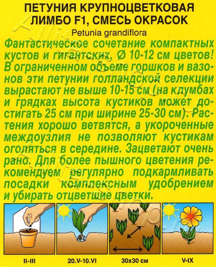 Фантастическое сочетание компактных кустов и гигантских, Ø 10-12 см цветов! В ограниченном объеме горшков и вазонов эти петунии голландской селекции вырастают не выше 10-15 см (на клумбах и грядках высота кустиков может достигать 25 см при ширине 25-30 см). Растения хорошо ветвятся, а укороченные междоузлия не позволяют кустикам оголяться в середине. Зацветают очень рано. Для более пышного цветения рекомендуем регулярно подкармливать посадки комплексным удобрением и убирать отцветшие цветки.Семена в гранулах! Гранулы располагают на поверхности почвы, не заделывая их, хорошо увлажняют из распылителя. При попадании влаги на гранулу оболочка должна раствориться. Посевы накрывают стеклом для сохранения постоянной влажности до полных всходов. Февральским посевам требуется дополнительная подсветка.