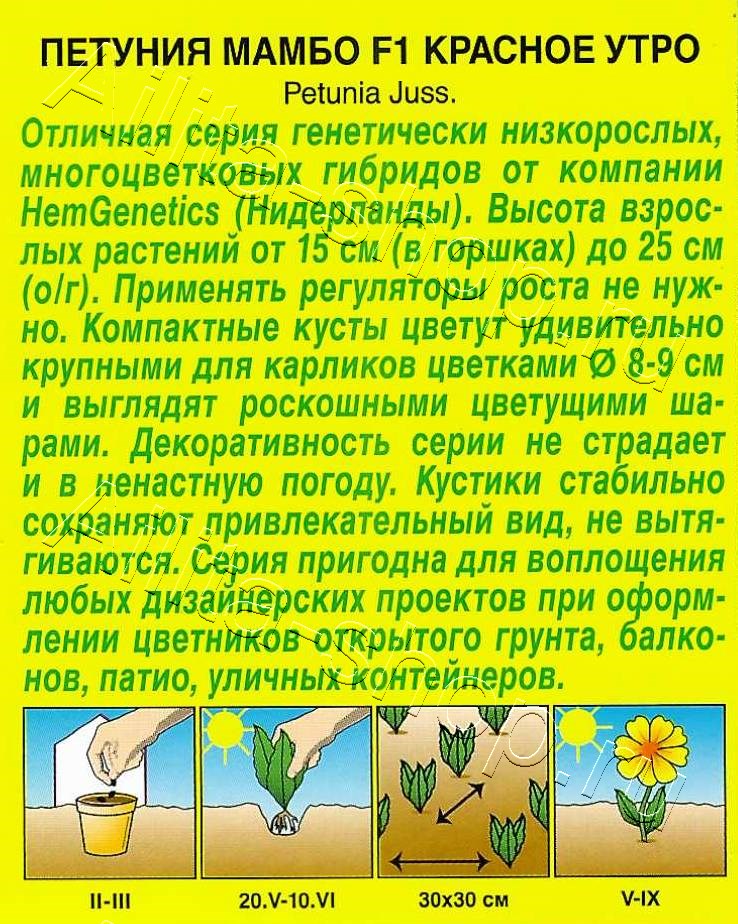 Ценная серия генетически низкорослых, обильно цветущих гибридов. Высота взрослых растений от 15 см (в горшках) до 25 см (о/г). Применять регуляторы роста не нужно. Компактные кусты цветут парадоксально крупными для карликов цветками Ø 8-9 см и выглядят роскошными цветущими шарами. Декоративность серии не страдает в ненастную погоду. Кустики стабильно сохраняют привлекательный вид, не вытягиваются. Серия пригодна для воплощения любых дизайнерских проектов при оформлении цветников открытого грунта, балконов, патио, уличных контейнеров.Посев на рассаду с февраля до апреля. Семена в гранулах! Посев поверхностный, без заделки (семена прорастают на свету!), под стекло или пленку для сохранения постоянной влажности до полных всходов. Гранулы при посеве должны раствориться! Февральским посевам требуется дополнительная подсветка. Всходы появляются на 5-6 день. Пикировка в фазе 1-2-х настоящих листьев. Высадка в грунт закаленной рассады в конце мая.
